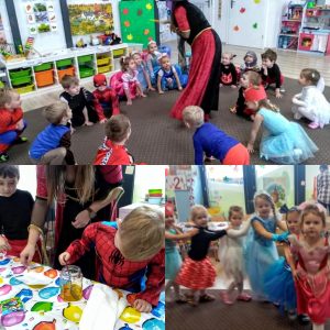 W piątek 6 listopada w przedszkolu obchodziliśmy Dzień Postaci z Bajek. We wszystkich grupach było kolorowo i wesoło. Każdy przedszkolak w tym dniu zamienił się w bajkową postać. Dzieciaki brały udział w przygotowanych przez nauczycielki zabawach, konkursach oraz tańcach. Dodatkowym atutem tego dnia był zdrowy poczęstunek.
