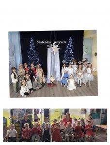 Dzieci wystąpiły przed rodzicami, a Zajączki zaprezentowały się również przed całą społecznością przedszkolną😊 Następnie wszystkie dzieci w magicznym nastroju zasiadły do wigilijnego stołu.