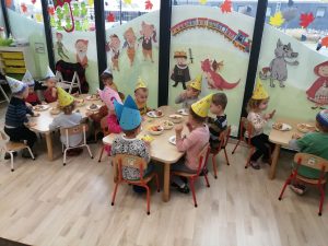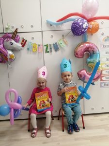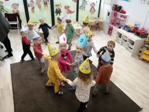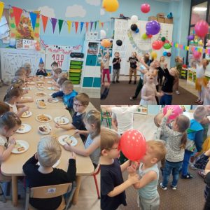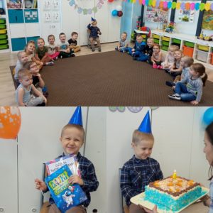 Jak co miesiąc, również w listopadzie obchodziliśmy urodziny dzieci urodzonych w tym miesiącu. Na solenizantów czekał tort, prezent w postaci książki oraz dyplom urodzinowy. Po wspólnym zaśpiewaniu ,,Sto lat”, wręczeniu upominków, dzieci mogły zjeść tort oraz zdrowe przekąski przyniesione przez rodziców. Dodatkowym atutem urodzin i najbardziej wyczekiwanym  jest wspólna zabawa przy muzyce.