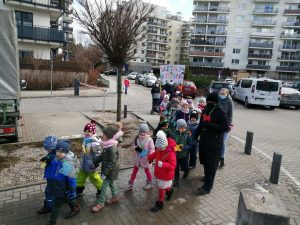 Gdy już wszystko było gotowe wokół przedszkola wyruszył barwny korowód. Dzieci radośnie śpiewały piosenkę wiosenną oraz głośno wypowiadali hasło: ,,Precz zimo, wiosno przybywaj”.