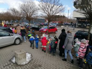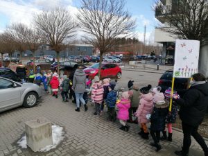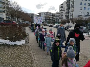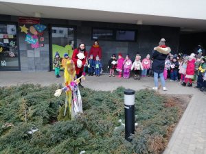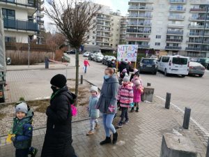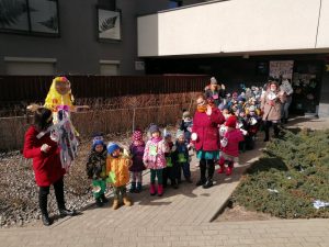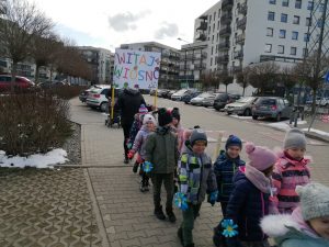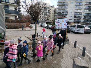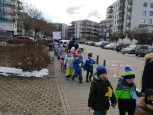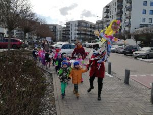 Gdy już wszystko było gotowe wokół przedszkola wyruszył barwny korowód. Dzieci radośnie śpiewały piosenkę wiosenną oraz głośno wypowiadali hasło: ,,Precz zimo, wiosno przybywaj”.